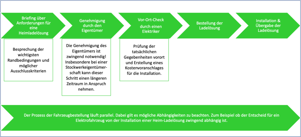 • Sicherheit: Bei der Einrichtung einer Ladestation beim Mitarbeiter zuhause, sollte in jedem Fall der Sicherheitsaspekt eine wichtige Rolle spielen. Es ist empfehlenswert bei der Ladeeinrichtung einen Fehlerschutzschalter (FI) vom Typ B zu integrieren. Eine zusätzliche Absicherung vor der Box ist empfehlenswert.