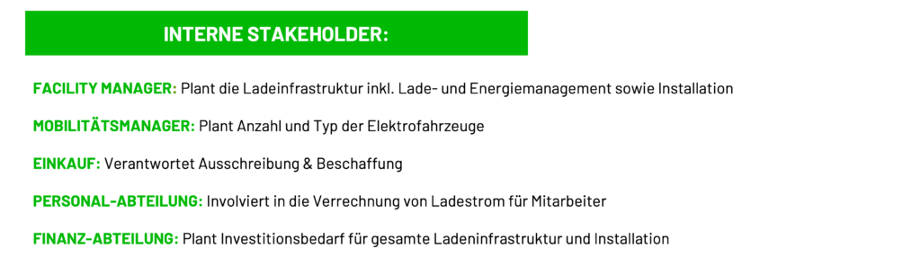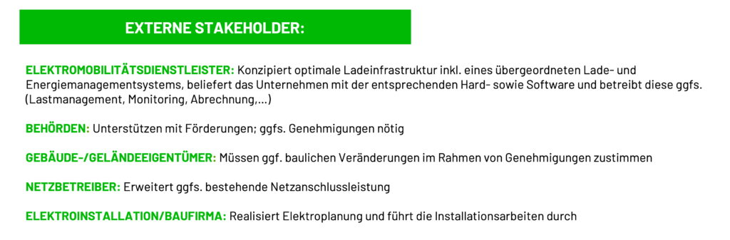 Für die Errichtung einer Ladeinfrastuktur an einem Firmenstandort gibt es sehr viele und ganz unterschiedliche Stakeholder. Je nach Grösse der geplanten Infrastruktur und Voraussetzungen variieren die Stakeholder und es müssen nicht in jedem Fall alle involviert werden. In der folgenden Auflistung zeigen wir Dir alle potentiellen Stakeholder auf. Du kannst dann individuell für Dein Unternehmen entscheiden, wen es für Euer Projekt braucht.