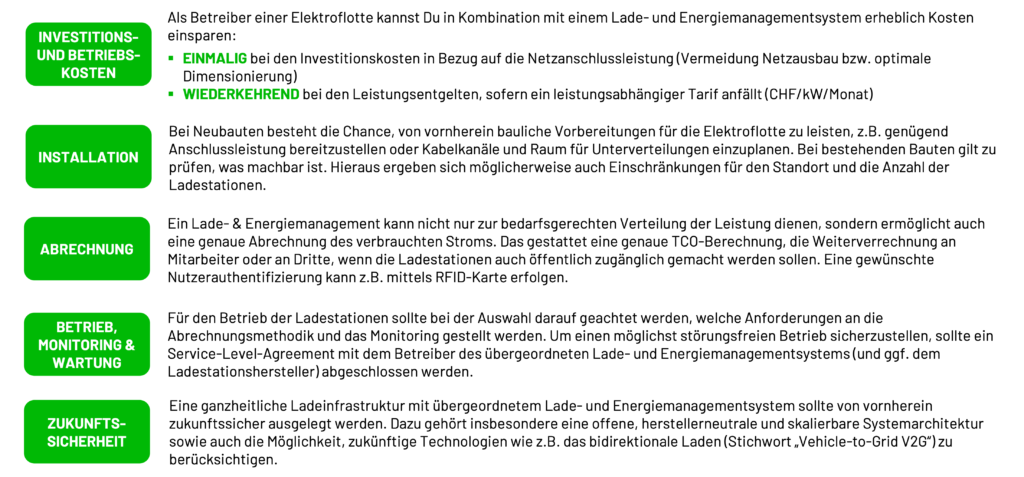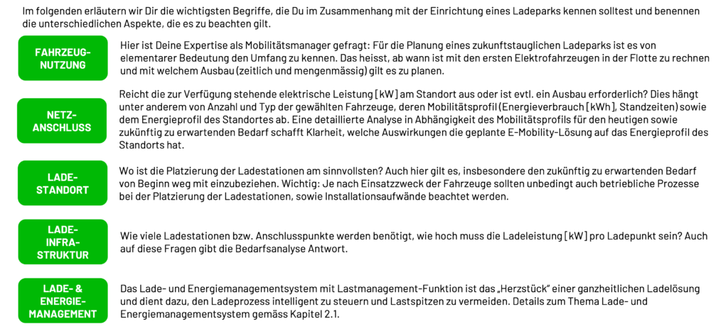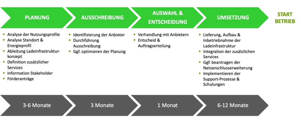 Insbesondere die Einrichtung eines grossen Ladeparks umfasst viele verschiedene Schritte. Ist zum Beispiel zusätzlich die Sanierung von Parkdecks oder Parkplätzen nötig oder sinnvoll, gilt es dies miteinzurechnen. Durch eine gute Planung und Vorarbeit, vor allem bei der Bedarfsanalyse und den notwendigen Genehmigungen, kann bei der Umsetzung viel Zeit eingespart werden.