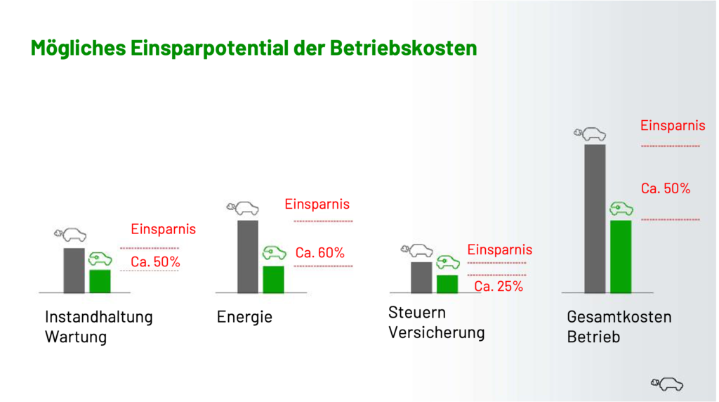 - Die Betriebskosten können sich mit dem Einsatz von E-Fahrzeugen deutlich reduzieren.