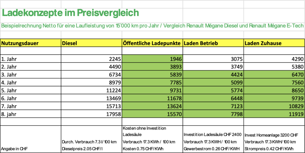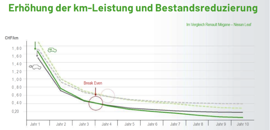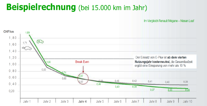 Bei dieser Beispielrechnung aus der Praxis wird der Break Even im 4. Nutzungsjahr erreicht. D.h. mit vier Nutzungsjahren oder länger wird der Einsatz zum Beispiel eines Nissan Leaf gegenüber einem Renault Mègane mit Dieselantrieb kostengünstiger. Eine Einschränkung gilt für diese Betrachtung: Die Abschreibung erfolgt jeweils für die dargestellte Nutzungsdauer. Wegen noch fehlender repräsentativer Gebrauchtwagendaten für E-Fahrzeuge wurde jeweils kein Restwert angesetzt.