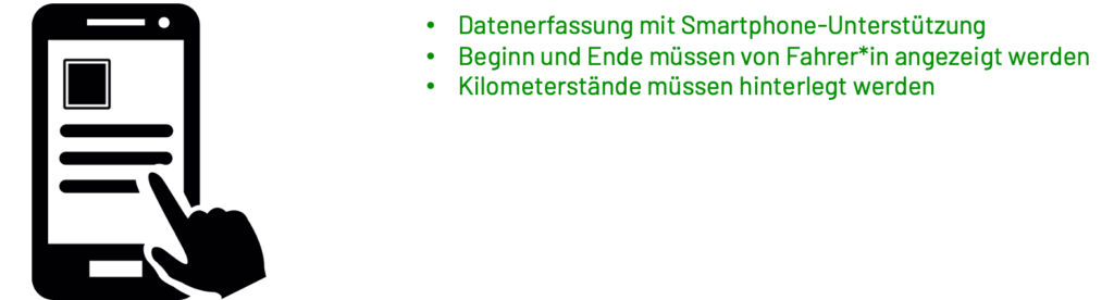 Es gibt auch die Möglichkeit die Datenerhebung der Fahrten über das Smartphone zu erfassen. Der Weg der Datenerfassung kann durch spezielle Smartphone-Apps unterstützt werden. Jedoch müssen die FahrerInnen Beginn und Ende einer Fahrt anzeigen und die KM-Stände von Hand eintragen oder hinterlegen.