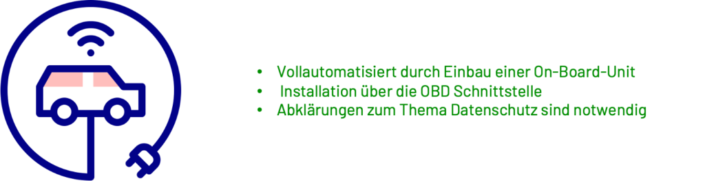 Es kann die vollautomatisierte Datenerfassung durch den Einbau einer On Board-Units (OBUs) erfolgen. Hier werden alle erforderliche Daten ohne Bedienung der Nutzer in einer Cloud oder auf dem Datenbankserver des Unternehmens gespeichert.