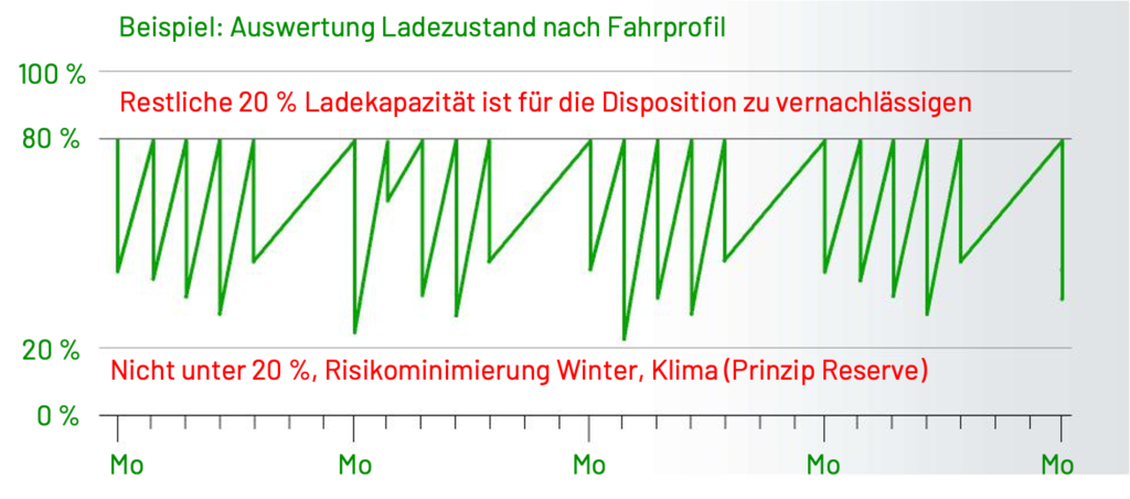 Optimale Bedingungen können bestätigt werden, wenn die genutzte Batteriespeicherung / Reichweite standardmäßig nur zu 80% genutzt wird. So bleiben 20% für überplanmäßige Reichweiten und überdurchschnittliche Verbräuche durch intensive Nutzung von Lüftung, Heizung und Klimaanlage. Außerdem sollten Sie im Blick behalten, dass die Ladezeit der letzten 20% Batterie-Speicherung schwer kalkulierbar bleibt.